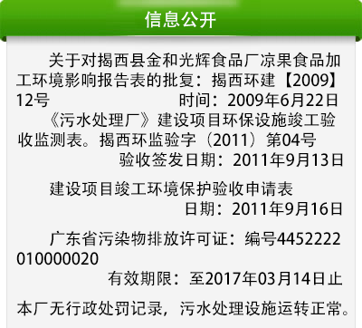 揭西县光辉食品厂坐落于揭西县金和镇金园开发区,拥有自己的研发机构和规范化的生产基地,以及国一流水平的生产设备,技术力量雄厚,是广东省规模较大的凉果生产企业...详细内容>>